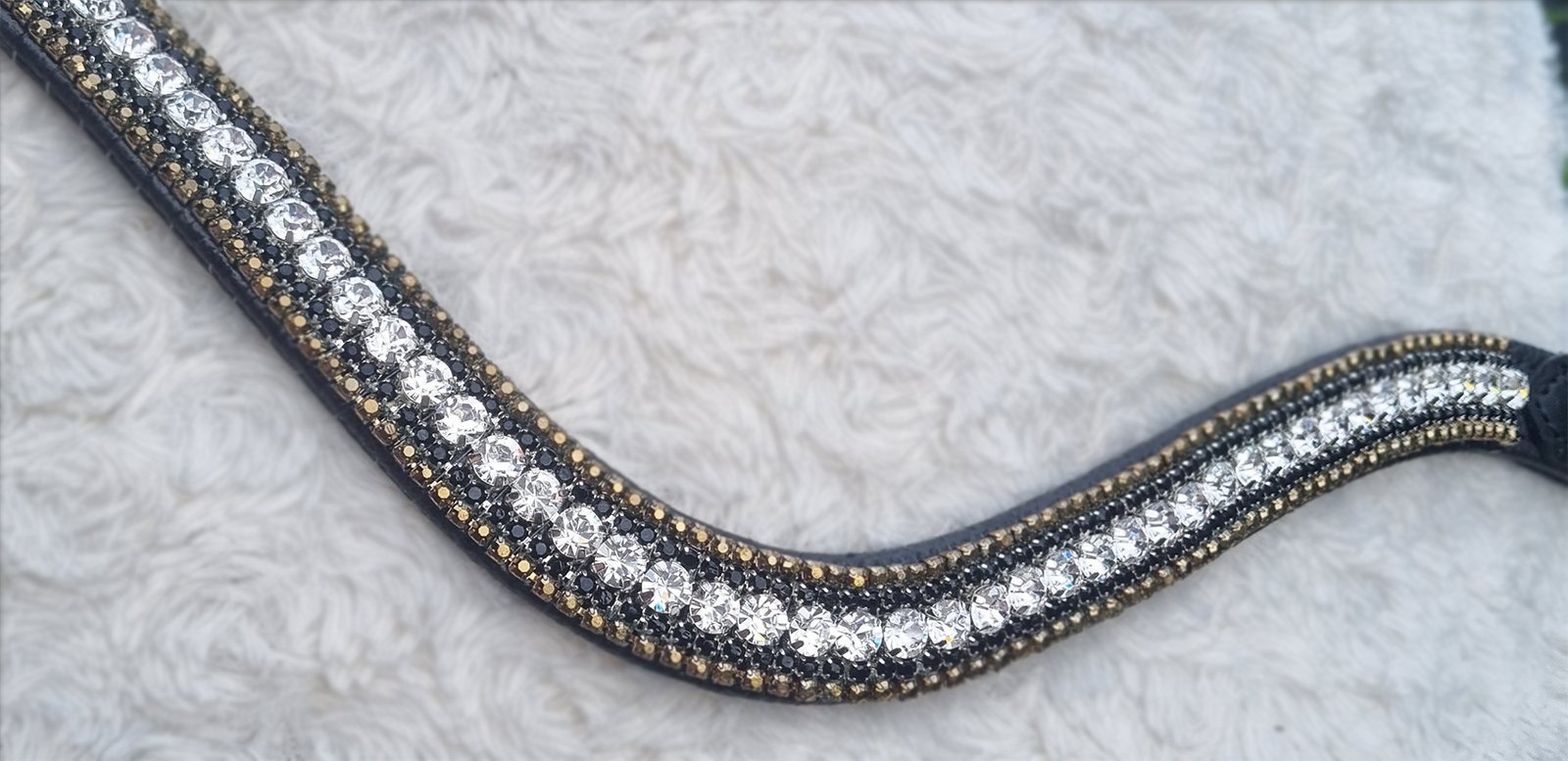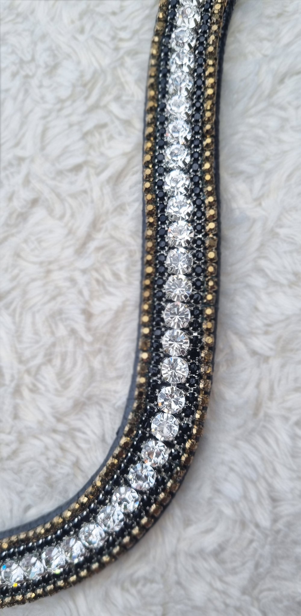 Magnifique frontal 5 rangs composé de cristaux Preciosa Crystal sertis de deux rangs de cristaux or et noir.
